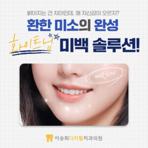 안녕하세요. 이승희디지털치과입니다❗ 치아는 단순히 음식을 저작하는 기능만 담당하는 것이 아니라, 외모와 첫인상에도 중요한 역할을 합니다. 가지런하고 깨끗한 하얀 치아는 밝고 건강한 이미지를 형성하는 데 도움이 되며, 이에 따라 많은 사람들이 단순한 구강 건강 관리뿐만 아니라 미적인 측면에서도 꾸준한 관심을 기울이고 있습니다. 하지만 시간이 지남에 따라 치아 표면이 더보기…